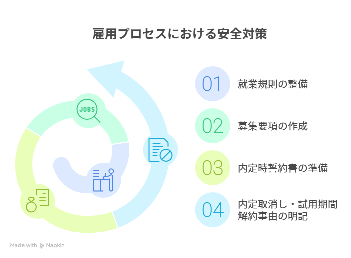 | 内定・雇用契約関係 | 内定取消し事由や試用期間に係る解約事由として、「重大な経歴詐称」を定めること |